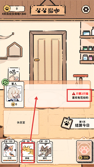 2、接待客人时,依据【只要2只猫-喜欢有花纹的】提示,先放置【胖橘】,满足客人对花纹猫的需求。