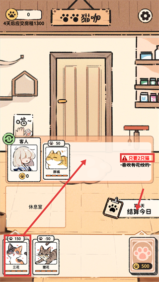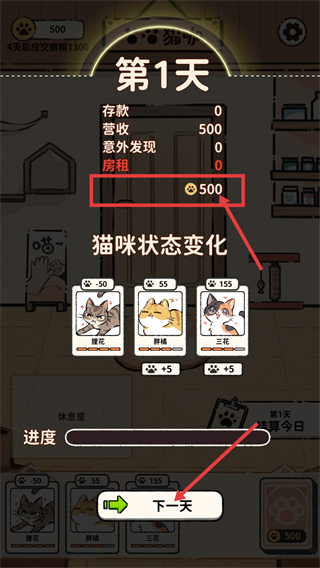4、第一天营收【500】,点击【下一天】,继续经营猫咖,解锁后续猫咪与客人,扩大猫咖规模。