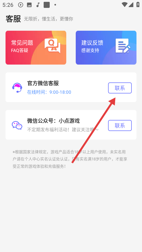 4、进入客服页面后,点击【官方微信客服】旁的联系按钮即可。