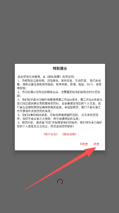 1、首次启动应用时,在特别提示隐私政策弹窗中阅读条款后,点击“同意”。