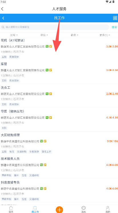 3、在“找工作”页面浏览职位列表,上下滑动可查看公司、岗位、薪资等详细信息,并投递简历。
