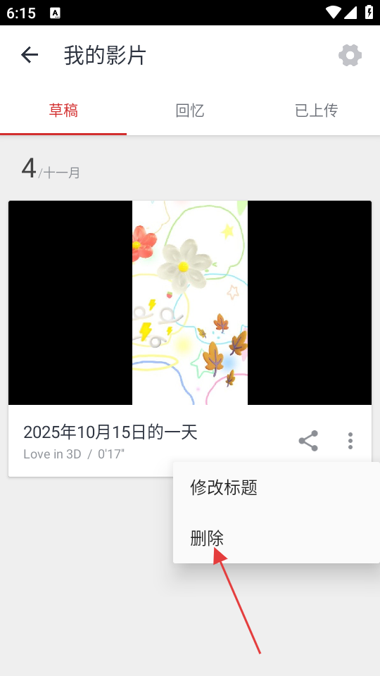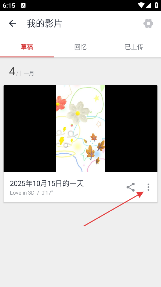 2、在“我的影片”界面,选择草稿分类,找到要删除的影片,点击其右侧的三点菜单按钮,可弹出操作选项。