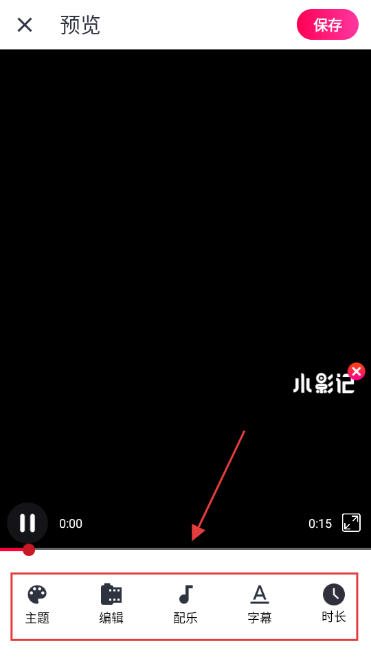 4、在预览界面,可对视频的主题、编辑、配乐、字幕、时长等进行调整,调整完成后点击【保存】可保存该视频。