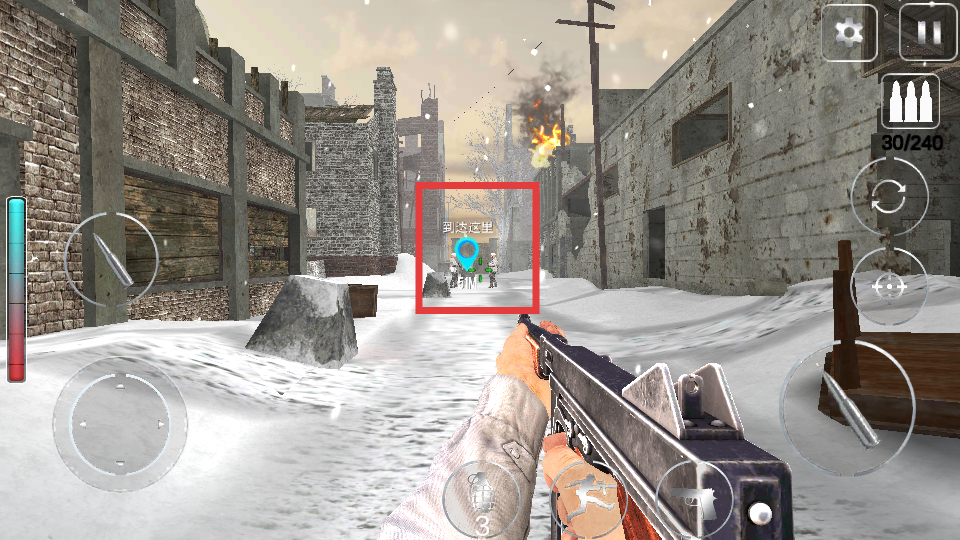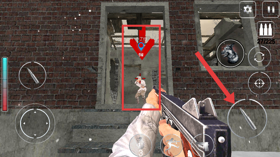 3、瞄准标记为“杀了他”的目标,点击射击按钮消灭敌人,完成击杀任务。