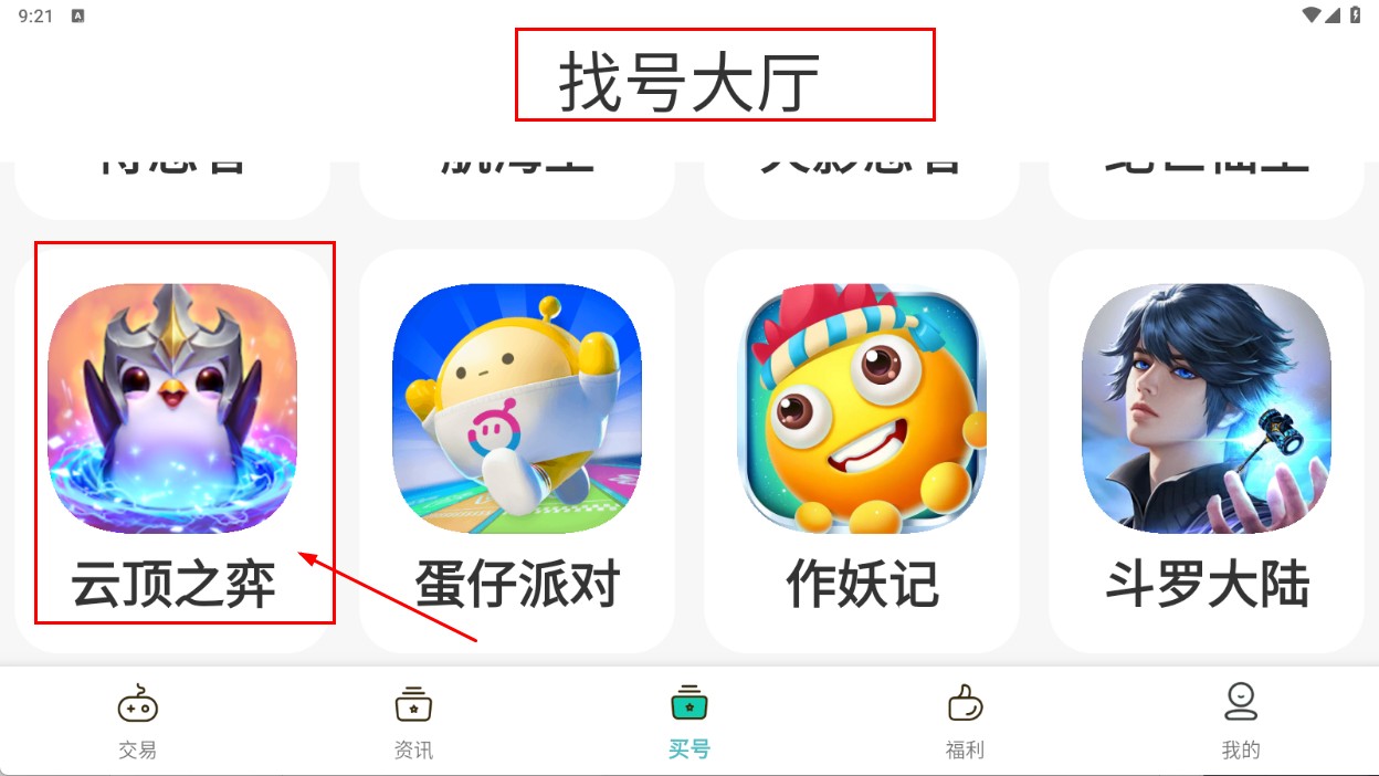 2、在找号大厅选择【云顶之弈-游戏图标】,进入对应游戏账号列表。
