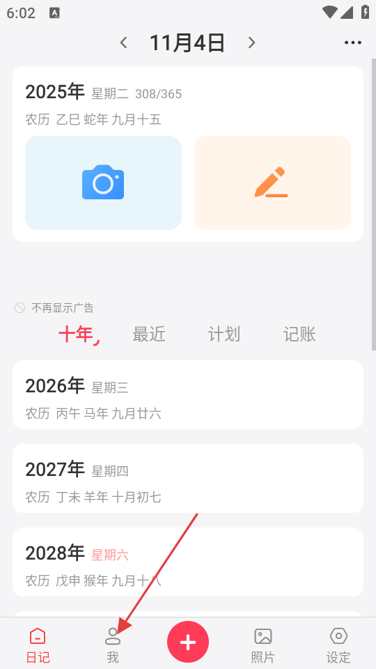 1、在日记页面,点击底部【我】选项,可进入个人中心界面。