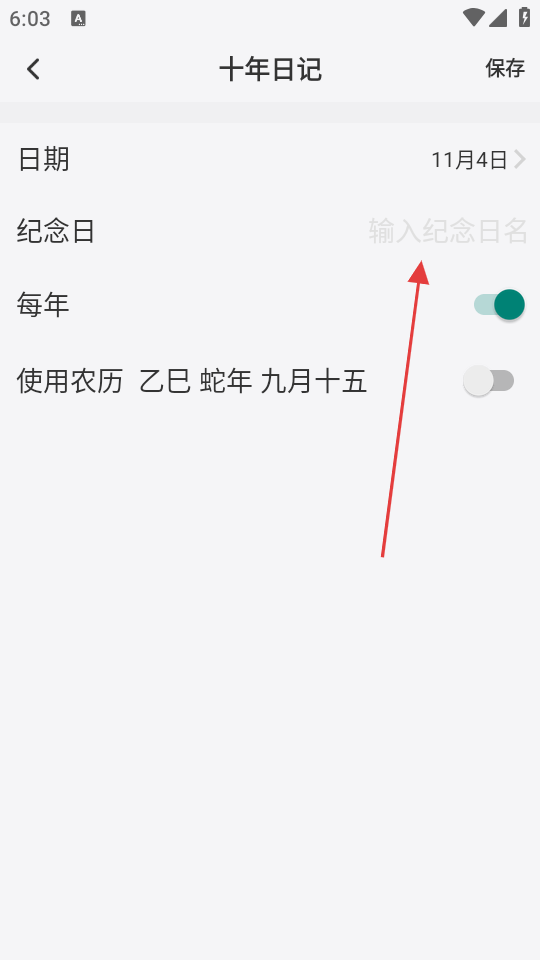 4、在编辑界面,输入纪念日名称,设置日期、是否每年提醒等信息后点击【保存】,可添加新的纪念日。