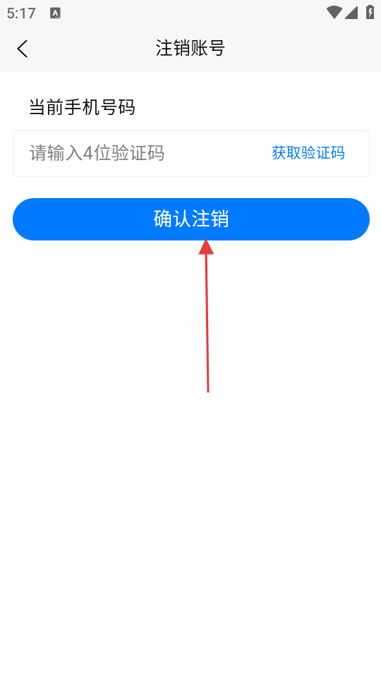 4、在验证界面中,输入验证码后点击【确认注销】按钮,可提交进行账号注销申请。