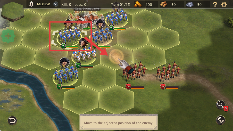 2、移动部队到敌人相邻位置,部署战斗阵型,为进攻做准备。