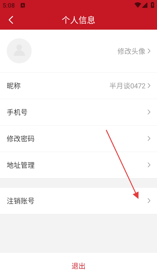 3、在个人信息界面,点击【注销账号】选项,可进入注销账号的验证界面。