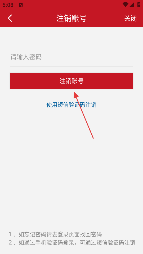 4、在验证界面,输入密码后点击【注销账号】按钮,或选择【使用短信验证码注销】,可提交账号注销申请。