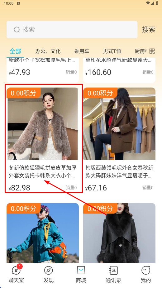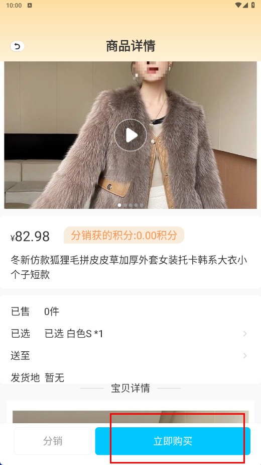1、在商品列表点击【冬新仿款狐狸毛拼皮皮草加厚外套-商品条目】,进入商品详情页。