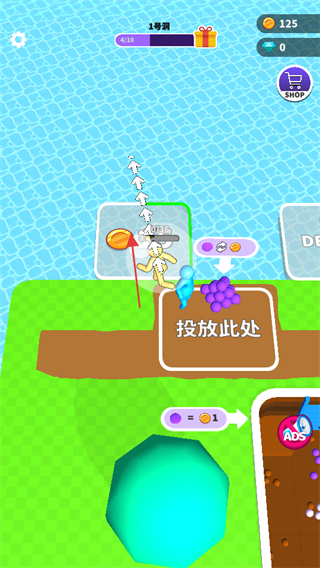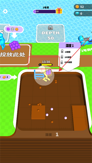 3、将挖掘的紫色矿石投放到指定区域,可兑换金币,积累金币用于解锁新矿洞、升级挖掘工或建造建筑。
