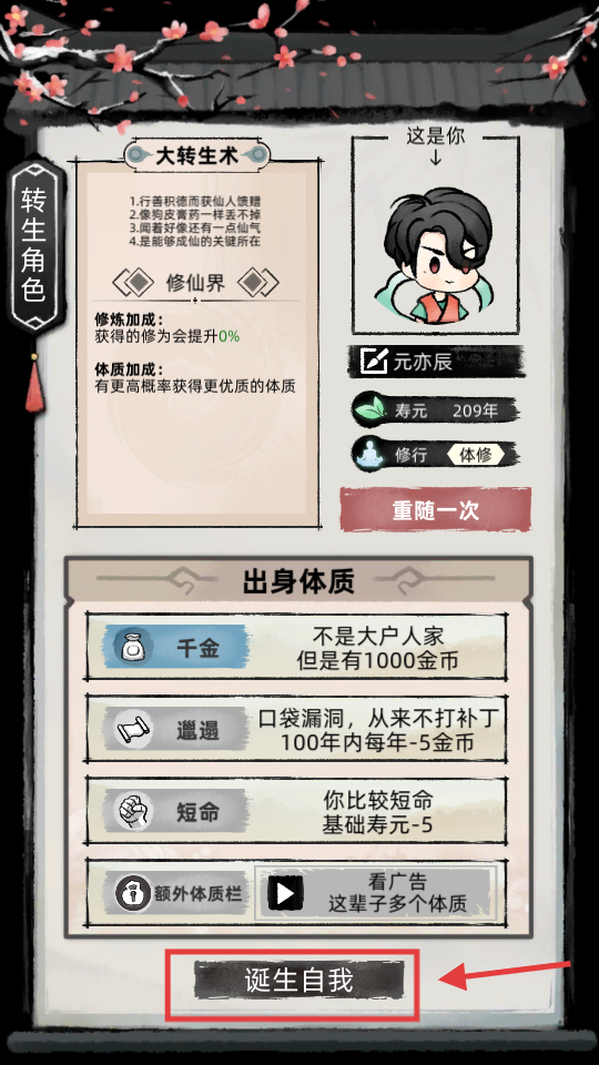 2、确定转生的修仙界、出身体质(可重随),点击诞生自我,正式开启角色修仙生涯。