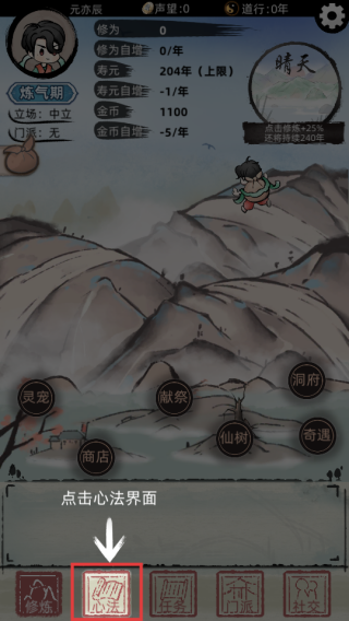 3、进入修仙主界面,点击下方【心法】按钮,进入心法系统,开启心法修炼或自研。