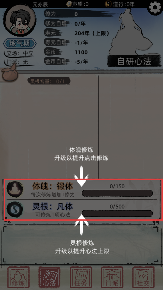 4、在心法界面,修炼【体魄-锻体】(加修为)、【灵根-凡体】(提心法上限),也可自研心法。