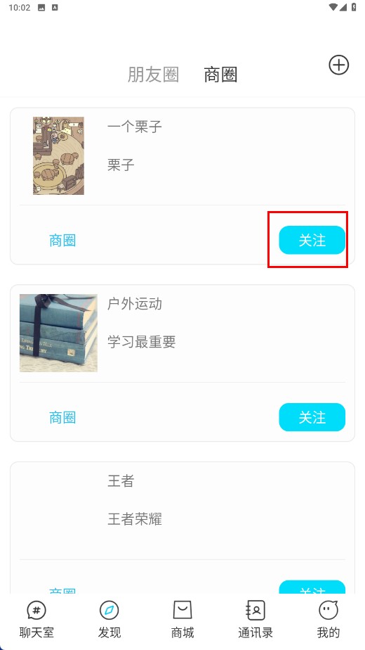 2、在商圈页面选择感兴趣的商圈条目,点击【关注-功能按钮】。