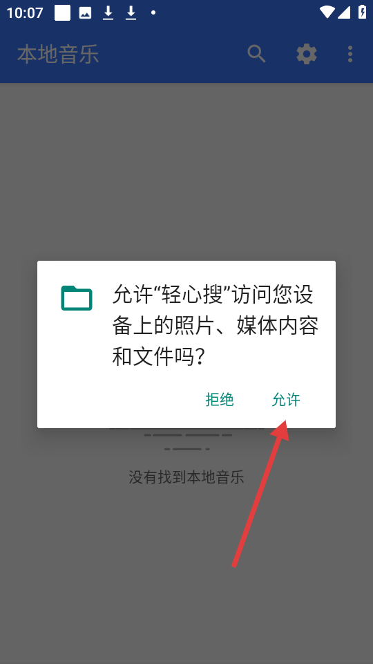 1、点击【允许】,授予“轻心搜”访问设备上的照片、媒体内容和文件的权限。