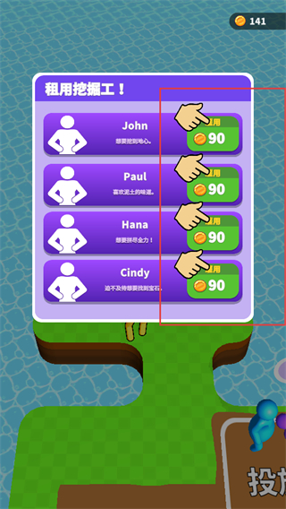 1、可租用挖掘工,每人花费90金币,增加挖矿人力,提升矿石挖掘和资源获取效率。