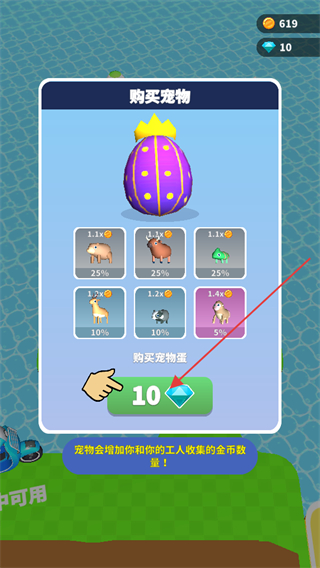 3、持续购买宠物蛋,可孵化出稀有度不同的宠物,稀有度越高,金币倍数加成越高,助力资源快速积累。
