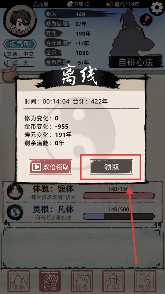 1、离线后点击【领取】,获取修为、寿元等变化,日常领取离线收益积累资源。