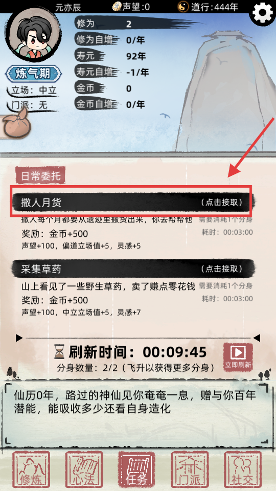 2、接取【撒人月货】任务,消耗1分身,获金币加500、声望加100、偏道立场加5、灵感加5。