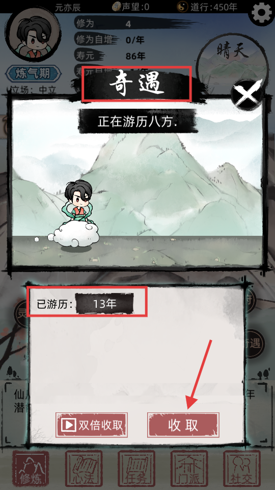 3、奇遇游历【13】年点击【收取】,获取游历奖励,提升修为等属性助力修仙。