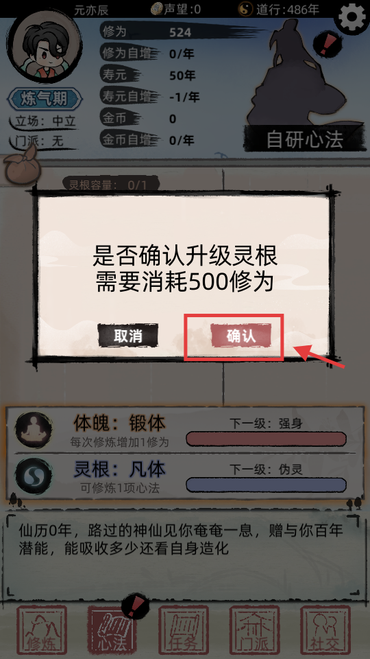 4、修为达500时点击【确认】升级灵根,提升灵根等级,可修炼更多心法。