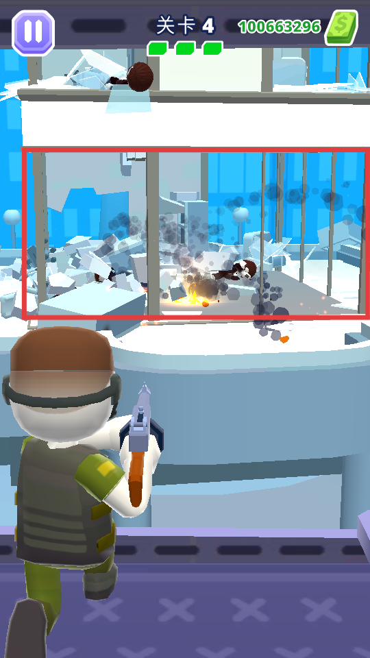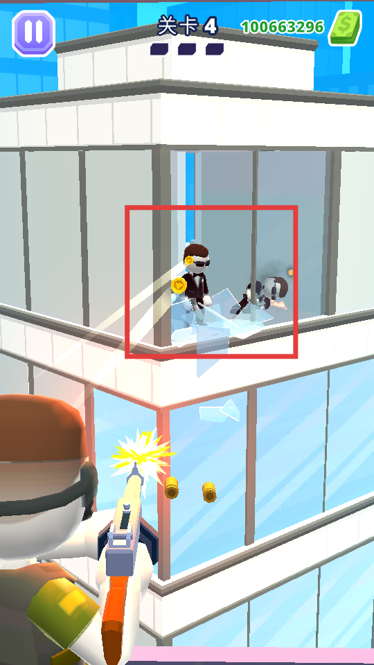 2、瞄准建筑内的敌人,射击消灭目标,注意敌人位置和战斗场景变化。
