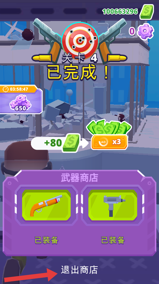 4、关卡完成后,获取金币、齿轮等奖励,可进入武器商店查看装备,点击【退出商店】继续游戏。