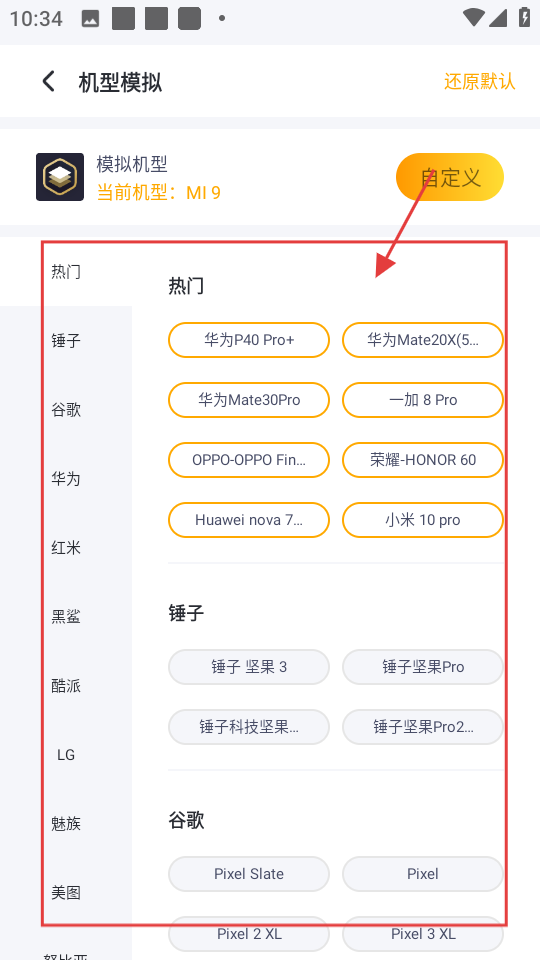 3、进入机型模拟页面后,可选择热门、锤子等品牌的机型,进行机型模拟设置啦。