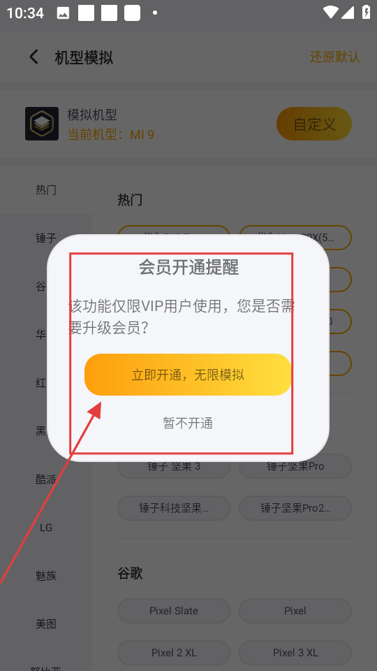 4、若使用机型模拟功能需会员,会弹出会员开通提醒,可选择立即开通或暂不开通哦。