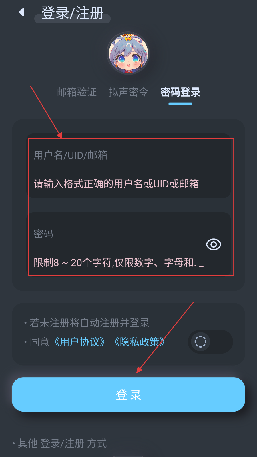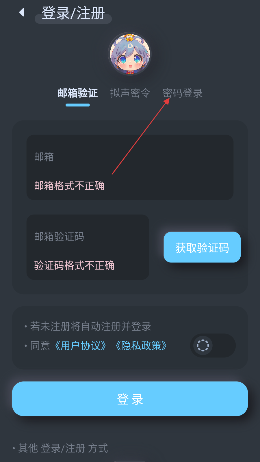 3、在登录/注册页面,点击【密码登录】,切换到密码登录界面。