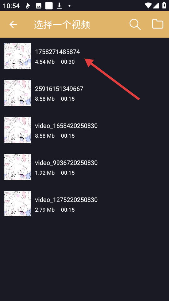3、在“选择一个视频”界面点击目标视频【1758271485874】进入切割界面。