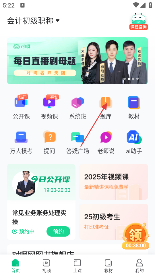 1、在首页,点击【题库】选项,可进入初级会计实务的题库界面。