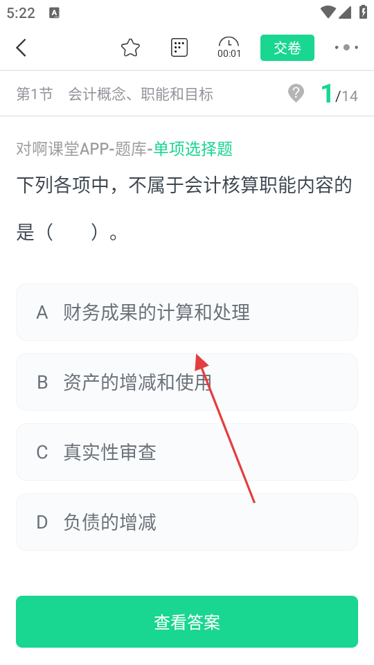 4、在练习界面,可进行题目作答,完成后可点击【查看答案】查看解析,或点击【交卷】结束练习。
