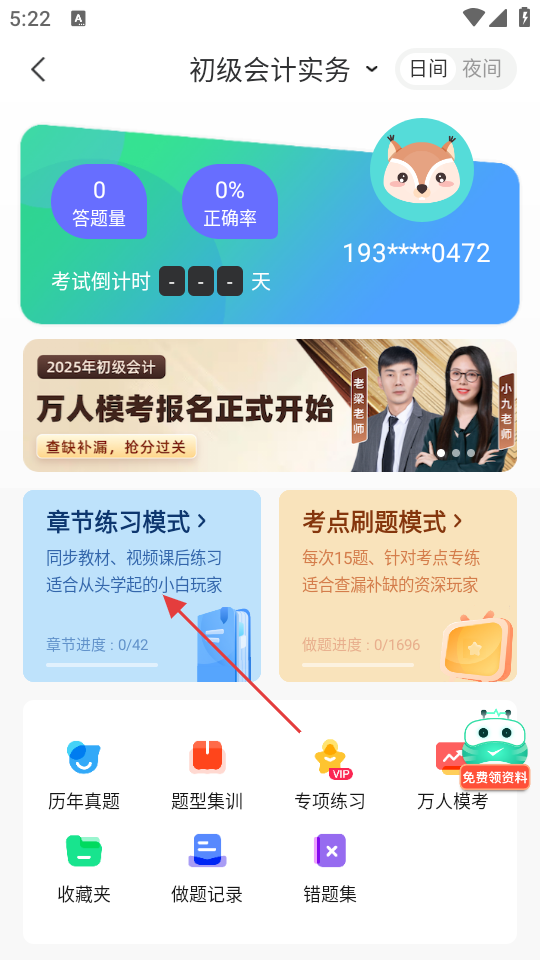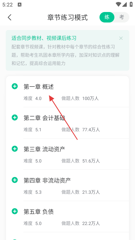 2、在题库界面,点击【章节练习模式】选项,可进入章节练习列表界面。