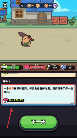 1、第【4】天协助巫师,获【最大生命-加-7%】,点击【下一天】推进,开启后续冒险事件。