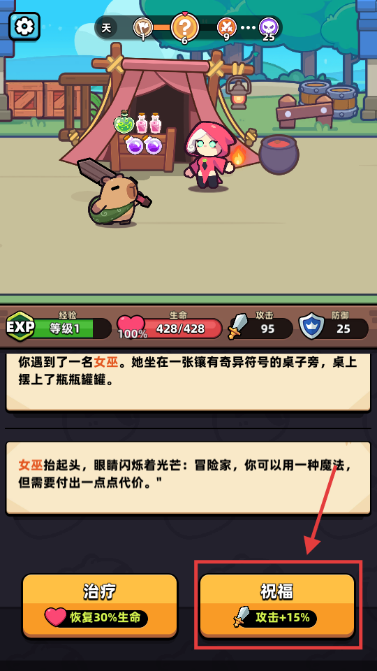 2、遇到女巫,选【祝福-攻击-加-15%】提升输出,虽有代价,却能增强战力。