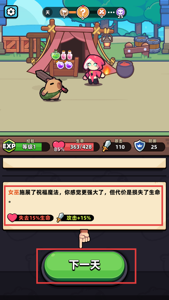 3、祝福后获【失去15%生命-攻击-加-15%】,点击【下一天】,用攻击加成挑战后续。