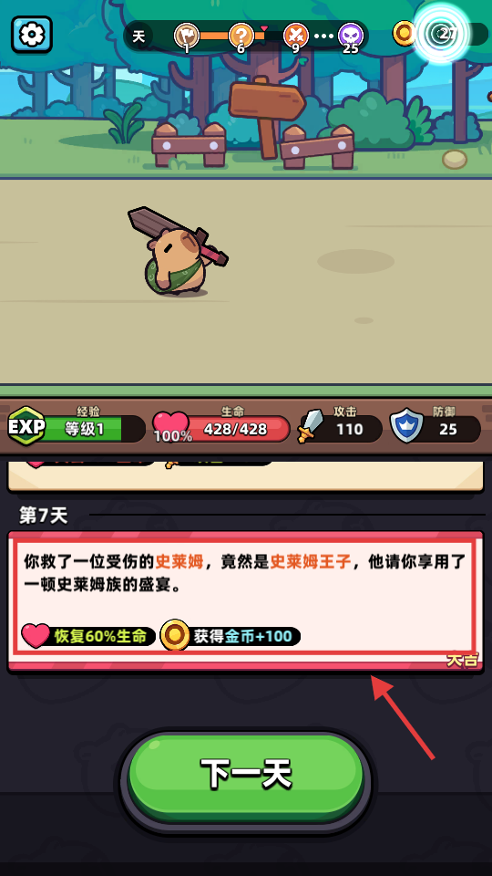 4、第【7】天救史莱姆王子,获【恢复60%生命-金币-加-100】,点击【下一天】积累资源。