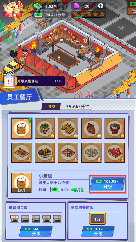 3、升级餐厅菜品,如小笼包,提升收益,积累资金,用于业务扩展。