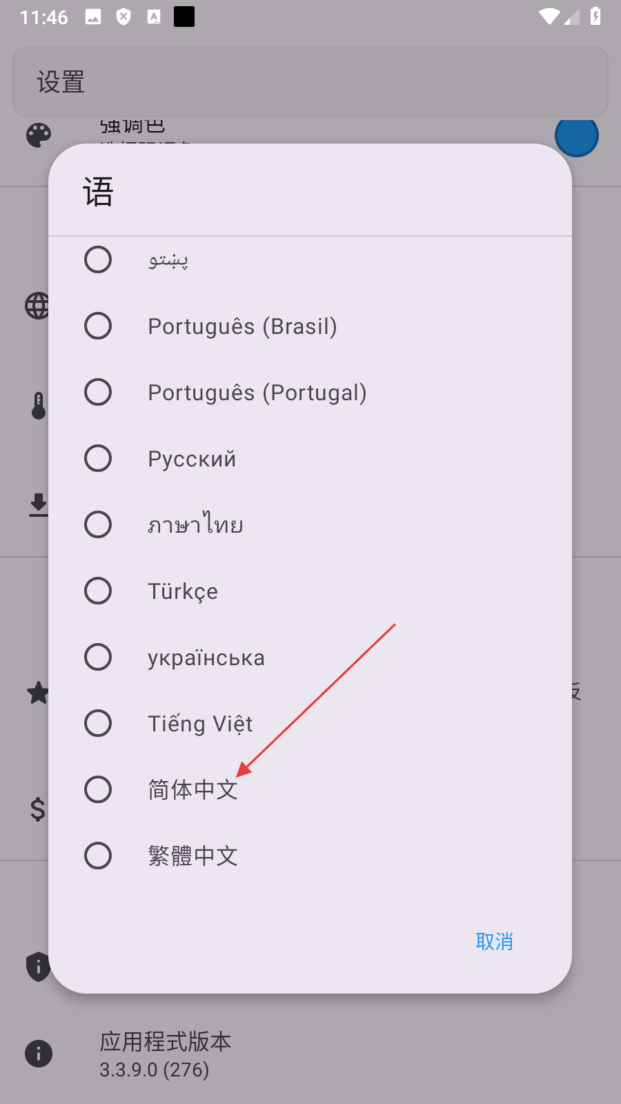 3、在设置页面,点击【语】,弹出语言选择弹窗。