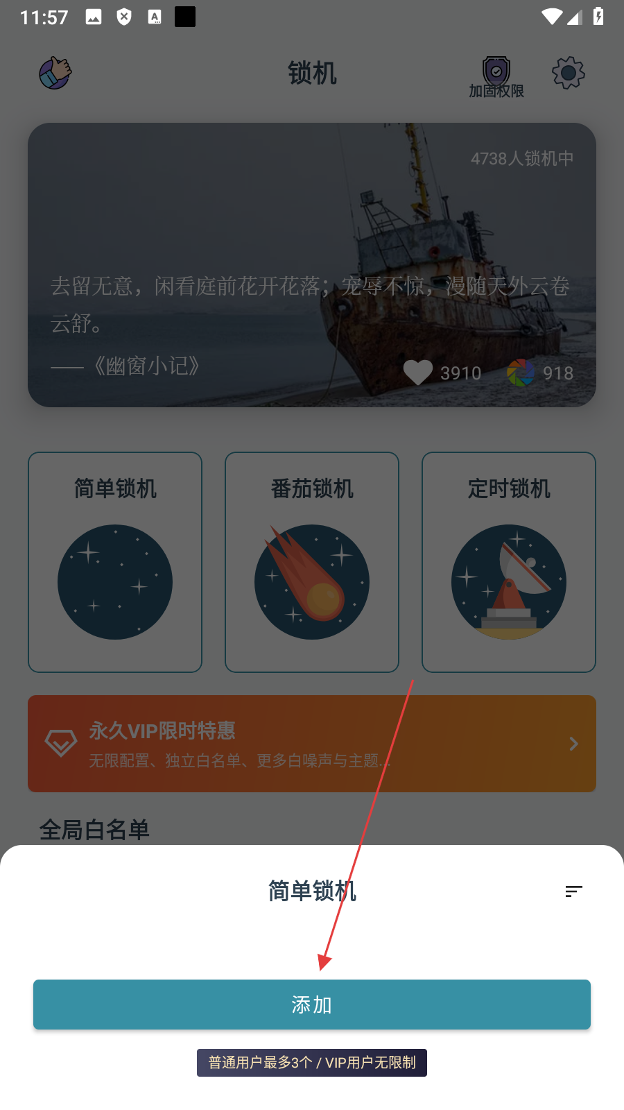 2、在操作选项中,点击【添加】,进入锁机时长设置页面。