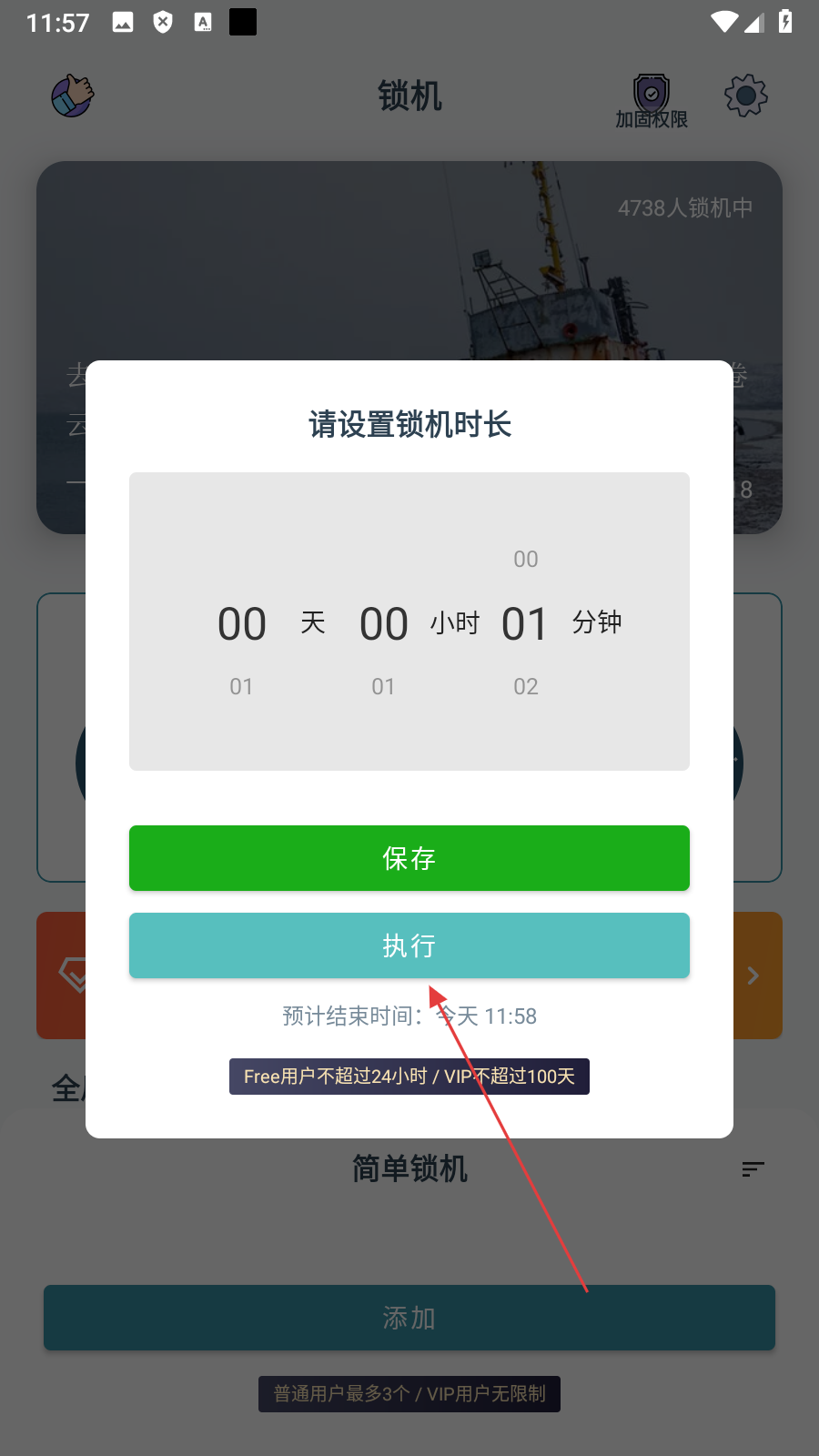 3、在设置页面设置锁机时长后点击【执行】,启动锁机操作。