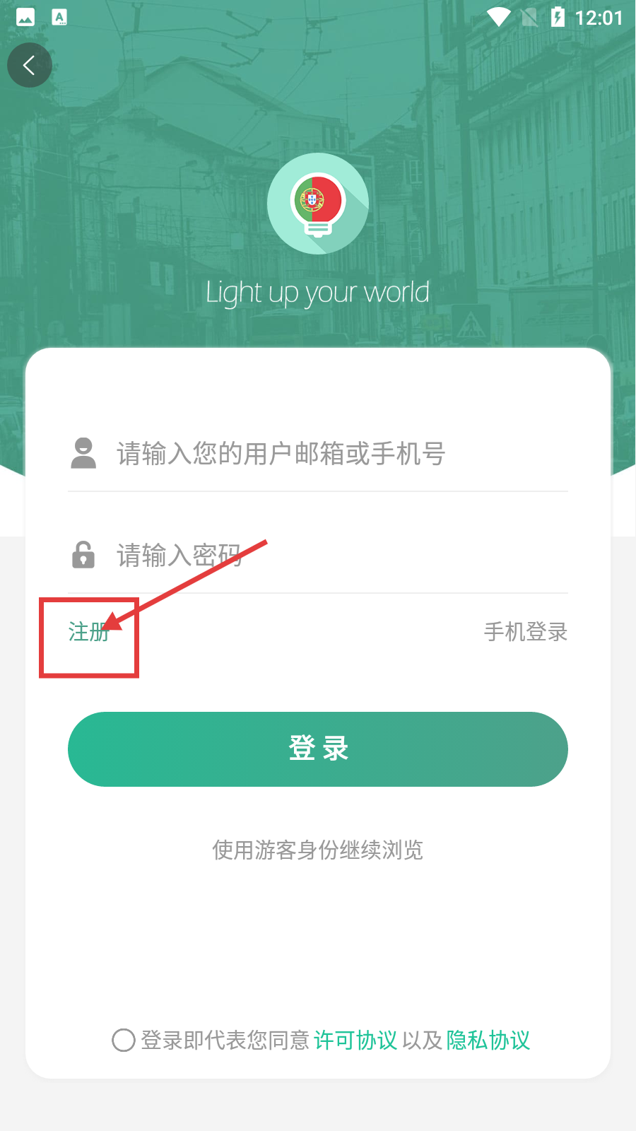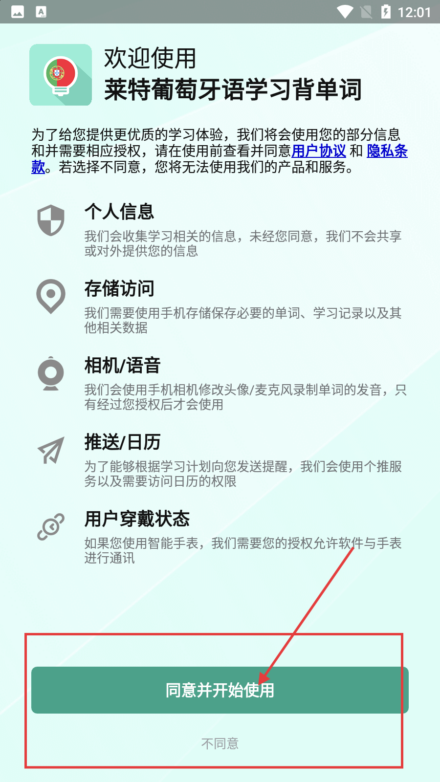 1、在【莱特葡萄牙语学习背单词】APP启动时,点击【同意并开始使用】按钮进入APP。