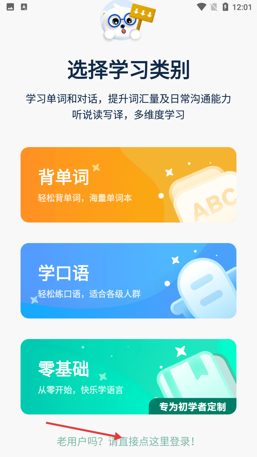 2、进入选择学习类别界面后,老用户可点击底部的登录提示,进入登录界面。