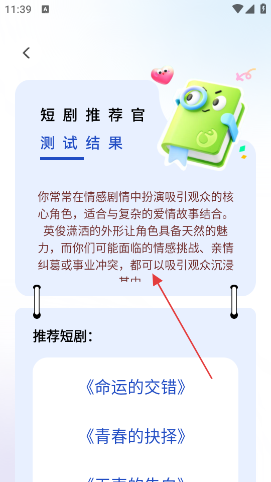 4、在测试结果界面,可查看匹配的测试结果及推荐的短剧列表。