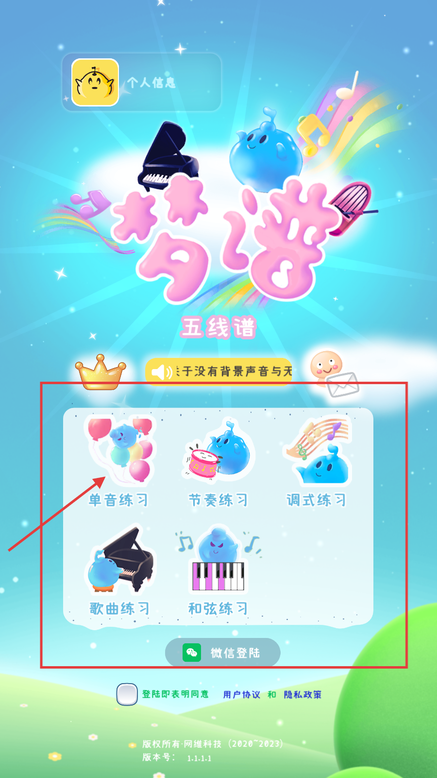 1、在【梦谱五线谱】APP主界面,可选择【单音练习】等多种学习模块,点击相应模块进入学习。