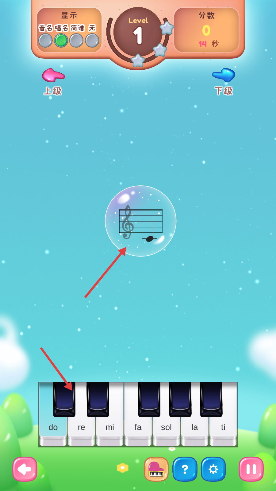3、在练习过程中,根据弹出的音符,点击对应的钢琴键(如do键)进行弹奏,完成单音识别与弹奏练习。